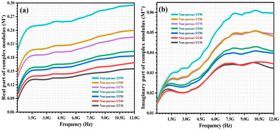 The complex modulus (M*) of the non-porous HAp/ST composites was investigated within a frequency range from 5 MHz to 12 GHz. Figure 2a,b show the frequency dependence of real modulus (M′) and imaginary modulus (M″) for the non-porous composites. The real modulus (M′) of all non-porous HAp/ST composites increases drastically in the lower frequency range and then increases gently with frequency. This might be due to the ease of polarons hopping mechanism in the low-frequency region. The charge carriers can move over long distances as the relaxation time at low frequencies is sufficient for alignment with the alteration of the electric field. It leads to the long-range mobility of charge carriers [10,16,23,24]. Generally, the M′ of the non-porous HAp/ST composites increases with frequency, which is attributed to the conduction phenomena due to the dominance of charge carriers with short-range mobility. It is associated with the insufficiency of restoring force to govern the mobility of charge carriers by exposure to a high-frequency electric field [14,18,25,26].