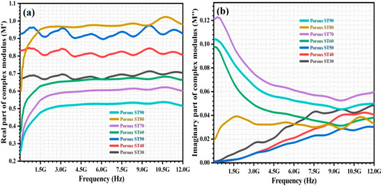 The variation of the M′ and M″ over frequency (5 MHz–12 GHz) for the porous HAp/ST composites is shown in Figure 3a,b, respectively. In Figure 3a, the multiple relaxation peaks could be observed in the M′ spectra of the porous HAp/ST composites with low ST proportion (30–50 wt%). In Figure 3b, M″ of the porous HAp/ST composites with low ST proportion (30–50 wt%) increases with frequency. The several step-like transitions in the complex modulus spectra of the porous HAp/ST composites (30–50 wt% ST proportion) indicate the presence of strong relaxation polarization processes. It might be attributed to the large agglomerated nanoparticles in the clustered porous microstructures. Both long-range and short-range mobility of the charge carriers is involved in the electrical transport process due to the imperfections within the material phases of the porous composites [1,4,30,31]. M′ and M″ of the porous HAp/ST composites increase and decrease, respectively, when the ST proportion increases from 30 wt% to 50 wt%. The small-size HAp agglomerates with large specific surface areas are more beneficial in increasing interface area compared with the large-size HAp agglomerates. As a result, the clustered porous microstructures with a low agglomeration effect are more favored in enhancing the electrical transport process [11,12,32].