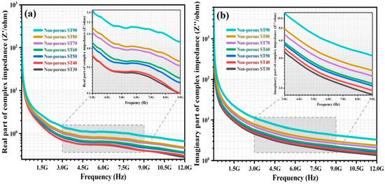 The complex impedance (Z*) of the non-porous HAp/ST composites was investigated within a frequency range from 5 MHz to 12 GHz. Figure 4a,b show the frequency dependence of real impedance (Z′) and imaginary impedance (Z″) of the non-porous composites.