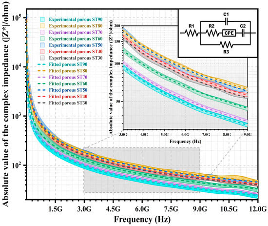 Impedance analysis via the development of an equivalent electrical circuit model is implemented for the correlation between microstructures and electrical behaviours of the HAp/ST composites. The |Z*| of the non-porous and porous HAp/ST composites with the equivalent electrical circuit models are shown in the inset of Figure 6 and Figure 7, respectively. Table 2 tabulates the electrical parameters of the equivalent electrical circuit models for the non-porous and porous HAp/ST composites. In Figure 6 and Figure 7, the chi-square (χ2) in Table 2 shows that the fitted |Z*| of each circuit model (dash lines) has good agreement with experimental results (open symbols) for the non-porous and porous composites. The best fit of the |Z*| spectra of the non-porous HAp/ST composites using an electrical equivalent circuit (Figure 6) consists of a capacitor (C1), a constant phase element (CPE), and three resistors (R1, R2, and R3). Meanwhile, the fitted |Z*| plots of the porous HAp/ST composites via measurement have good agreement with the equivalent electrical circuit (Figure 7). This circuit model consists of a constant phase element (CPE), two capacitors (C1 and C2), and three resistors (R1, R2, and R3). The serial resistor (R1) represents the intrinsic resistance. Parallel resistance (R3) refers to the charge transfer resistance of the composites. R1 (1.60–3.45 Ω) and R3 (1.25 × 105–9.80 × 108 Ω) of the porous HAp/ST composites are larger than the non-porous HAp/ST composites (R1: 0.22–0.46 Ω; R3: 0.75 × 104–0.32 × 105 Ω), as listed in Table 2. It suggests that the non-porous composites have a higher conductivity than the porous composites.