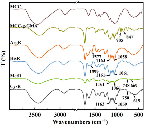 FTIR spectra of MCC, MCC-g-GMA, and the amino acid resins are demonstrated in Figure 1. For MCC-g-GMA, there were new peaks at 905 and 847 cm−1, which are the characteristic peaks of epoxy groups [24]. This indicates that GMA was successfully grafted onto MCC. The new characteristic peaks at 1577, 1163, and 1058 cm−1 were seen in the spectrum of ArgR, which was related to the vibration of N-H and C-N of arginine [28,31]. In the spectrum of HisR, the vibration adsorption of the N-H (1599 cm−1) and C-N (1161 and 1061 cm−1) bond were observed. There were two weak peaks at 748 and 669 cm−1 in the MetR spectrum, which are characteristic peaks of the C-S bond [32]. In addition, the new peaks at 1161 and 1066 cm−1 are characteristic peaks of the C-N bond. For CysR, the characteristic peaks of C-S and C-N bonds at 750, 619 cm−1, 1163, and 1059 cm−1 were observed. Additionally, the intensity of the characteristic peaks of the epoxide group significantly decreased after amino acid functionalization. So, the synthesis of the amino acid resins was obviously successful.