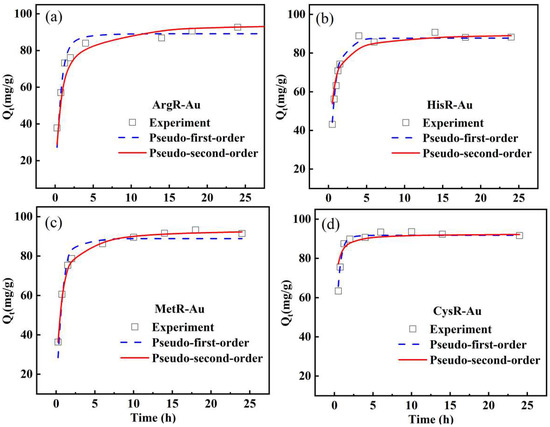 The adsorption kinetics of ArgR (a), HisR (b), MetR (c) and CysR (d) for Au(III) ions (C0 = 100 mg/L, adsorbent mass = 10 mg, volume = 10 mL, pH = 2, T = 30 °C).