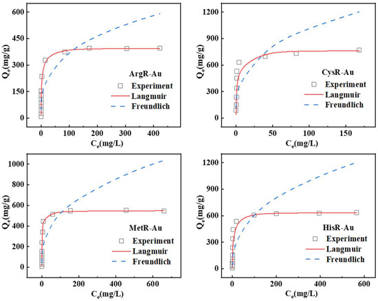 In order to explore the maximum adsorption capacity of different amino acid resins for Au(III), the adsorption capacity of each amino acid resin under different initial concentrations of Au(III) was studied. As shown in Figure 4, the amount of Au (III) adsorbed on the adsorbents sharply increased with the increase in Au (III) concentration, and then tended to approach a constant value at a higher concentration. The Langmuir (Equation (7)) and Freundlich (Equation (8)) models were used to fit the experimental data [37,38].