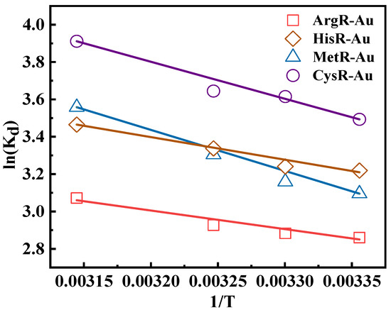 Van’t Hoff plots of amino acid resins for Au(III) ion adsorption (C0 = 100 mg/L, adsorbent mass = 10 mg, volume = 10 mL, pH = 2, contact time = 24 h).
