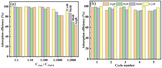 The effect of NaCl concentration on the Au(III) ion adsorption capacity of amino acid resins is shown in Figure 6a. The results show that the Au (III) adsorption efficiency of amino acid resins decreased with an increase in NaCl concentration. This is mainly because of the shielding effect of chloride ions on the electrostatic interaction between Au(III) ions and the amino acid adsorbents. This proves that the mechanism by which partial Au(III) ions were adsorbed was ion exchange. The adsorption of ArgR-Au and HisR-Au on Au(III) ions was more affected by salt concentration, but when C(Au): C(NaCl) was 1:1000, their adsorption efficiency was more than 80%, and the adsorption effect was also better. For MetR and CysR, although C(Au): C (NaCl) reached 1:2000, their Au(III) ion adsorption efficiency was still more than 85%, indicating that MetR and CysR can effectively adsorb Au (III) ions under high ionic strength. This phenomenon is consistent with the results shown in Figure 2, where it can be seen that the adsorption capacities of MetR and CysR were higher than those of ArgR-Au and HisR at pH 1.