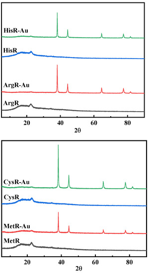 The XRD analysis of amino acid resins before and after Au(III) ion adsorption is shown in Figure 7. The formation of Au (0) after absorption was further confirmed by the XRD spectrum; the new peaks at 38.13°, 44.38°, 64.64°, 77.59°, and 82.11° corresponded to five diffraction peaks at the (111), (200), (220), (311), and (222) crystal faces of Au (0), which appeared after adsorption, suggesting the Au(III) ion recovery was carried out via an adsorption–reduction mechanism [3,24].