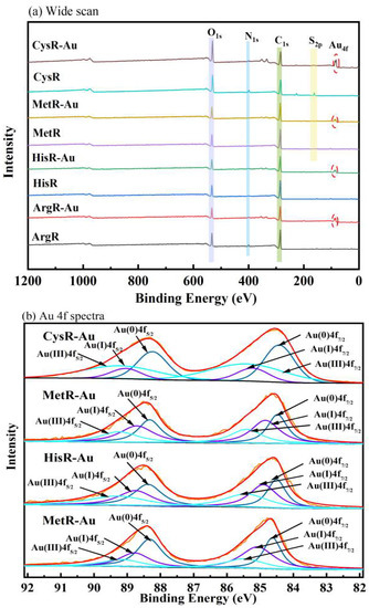 Figure 8 illustrates the XPS spectra of amino acid resins before and after adsorption. The wide-scan spectra are shown in Figure 8a. The dominant peaks of ArgR and HisR were C1s, O1s, and N1s, and the dominant peaks of MetR and CysR were C1s, O1s, N1s, and S2p, indicating that the four amino acids were successfully introduced into cellulose., The Au4f peak at 82–92 eV appearing after adsorption represents the adsorption of Au (III) by amino acid resins [3].
