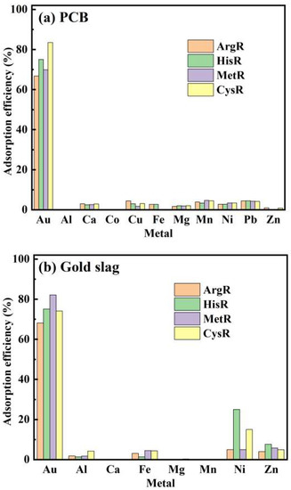 For the printed circuit boards (PCBs), 20 g of PCB was used as a raw material. First, a PCB was smashed, and the objects floating in the water were removed. Then, the PCB was mixed with 3 M HCl for 3 h and 3% FeSO4 for 8 h. The solid residues were treated with a similar process to that used for the slag residues to obtain the PCB leaching solution. The main metals present were Au, Al, Cu, Ca, Fe, Mg, Mn, Ni, Pb, and Zn. Subsequently, 0.02 g of amino acid resin was soaked in 5 mL of PCB leaching solution (pH 2). Figure 9 show the adsorption efficiency of different amino acid adsorbents for Au(III) ions in the presence of other metal ions. The Au(III) ion recovery efficiencies of ArgR, HisR, MetR, and CysR were 66.8%, 75.1%, 69.9%, and 83.5%, respectively.