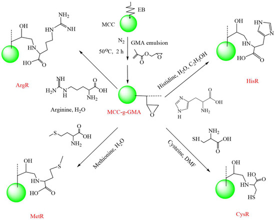 Secondly, the MCC-g-GMA (2.0 g) was immersed into different solutions and allowed to react at 80 °C for 24 h. The solution was divided into four types: 20 mL of 10 wt% arginine aqueous solution, 20 mL of 20 wt% cysteine DMF solution, 20 mL of 10 wt% methionine aqueous solution, and 20 mL of 10 wt% histidine 50%H2O/50% EtOH solution. After the reaction, these final products were washed with de-ionized water and dried at 60 °C to a constant weight. Scheme 1 shows the preparation procedure for the amino acid resins.