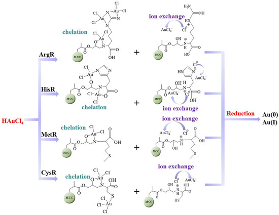 In recent years, amino-acid-functionalized materials have attracted much attention because amino acid contains carboxylic acid, amine, and sulfhydryl groups (−COOH, −NH2, and −SH), which can be easily conjugated to metal ions. Several researchers reported the adsorption and reduction of Au(III) ions by amino acid [11,26,27]. However, very little investigation has been reported for Au recovery from a practical leaching solution of printed circuit boards (PCBs) and gold slag using amino-acid-functionalized materials.