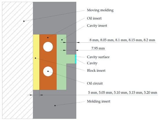 In this study, various combinations of insertions were used to adjust the cavity thickness and change the cavity surface roughness. The inserts were assembled in a molding insert on the moving die, which was composed by a block insert, an oil insert and a cavity insert, and was the assembled as shown in Figure 1. It was assembled into a cavity of variable thickness and surface roughness. The cavity thickness was changed by matching the cavity inserts of different sizes to the molding inserts. Additionally, the cavity surface roughness was adjusted by replacing the cavity inserts with different roughness surfaces. The specific assembly scheme was shown in Figure 2. The molding insert was 170 mm × 160 mm × 35.2 mm. The five heights of the molding inserts were 8 mm, 8.05 mm, 8.10 mm, 8.15 mm and 8.20 mm, respectively, on fit positions with the cavity inserts. The boss height of the cavity inserts was fixed at 7.95 mm, in which the boss is the cavity surface of the experimental cavities. The molding inserts with different boss heights matched with the fixed-size cavity insert. The bosses of the cavity inserts were polished by different polish method for different cavity surface roughness.