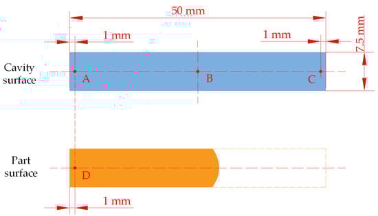 The surface roughness of parts and cavities were using a nano 3D optical surface profilometer (SuperView, Chotest Technology Inc., Shenzhen, China). In this study, it was assumed that the cavity surface roughness was the same at any position of the cavity surface. Three points on the cavities were chosen to determine the roughness of the cavities, which were named point A, B as well as C and located on left, middle and right of the cavities, respectively, as shown in Figure 2. In order to investigate the roughness replication ratio, beside measuring the cavities surface roughness, it was also necessary to measure the surface roughness of the parts. The measurement point D on the part was the point where all the parts in the experiment can be filled. Additionally, it was the same position as the points on the cavities for the sake of simplicity. The position of the point D on the parts is shown in Figure 2. For more stable experimental results, the surface roughness of each point was measured three times, and the average value was taken as the surface roughness of the point.