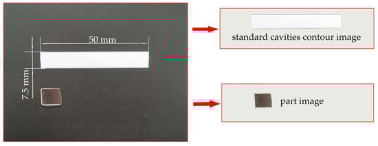 To determine the parts acreage and cavities acreage, an image processing method [37] was introduced in this study and it is shown in Figure 3. First, a standard white rectangle, same as the cavities, was printed on black paper at a ratio of 1:1, with a large color difference from the background, so that the cavities’ contours could be easily identified at a later stage. The parts were placed next to the cavities pattern, which has a large difference between its color and the background color, and the contour of the part can be easily identified by image processing to calculate its acreage. The standard cavities’ contour and the parts were photographed, and then the images were processed to obtain the standard cavity contour images and the parts images. The acreage of the parts and cavities were calculated by the number of pixels contained in the standard cavities contour image and the parts image. It was supposed that the n1 (pt) and n2 (pt) were the number of pixels in parts image and standard cavities image, according to Equation (1), the filling integrity was deduced below as Equation (2).