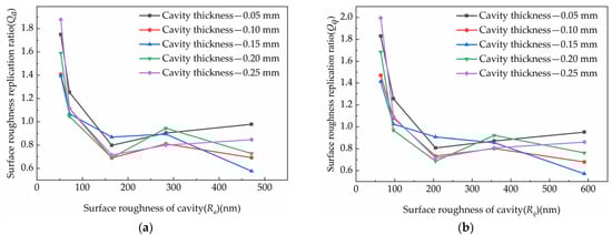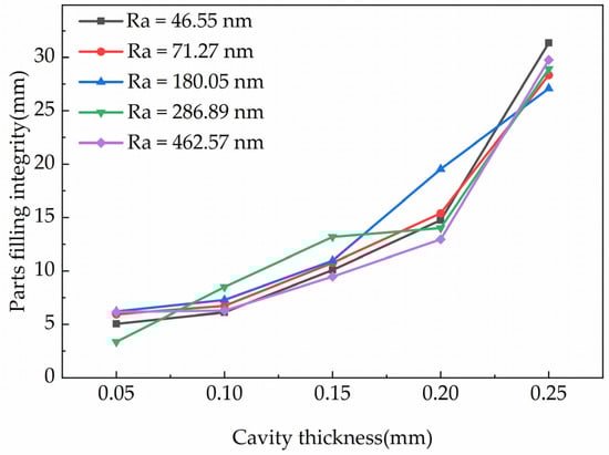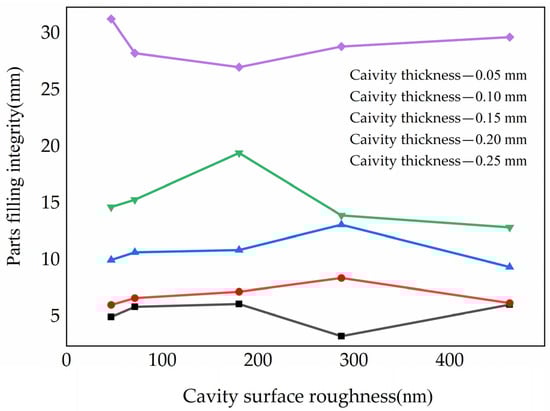 It was found that the effects of the roughness of the cavity roughness on the filling flow of the molten polymer gradually decreased with increasing cavity thickness, as shown in Figure 6. The effects that named as microscale effect generated because of the μIM were different from CIM in principle and regularity [29]. Additionally, the effects also explained the contradiction in the relationship between the roughness of the cavity surface and the cavity thickness. Cavity thickness influenced the filling laws significantly during the injection process and deduced different results.