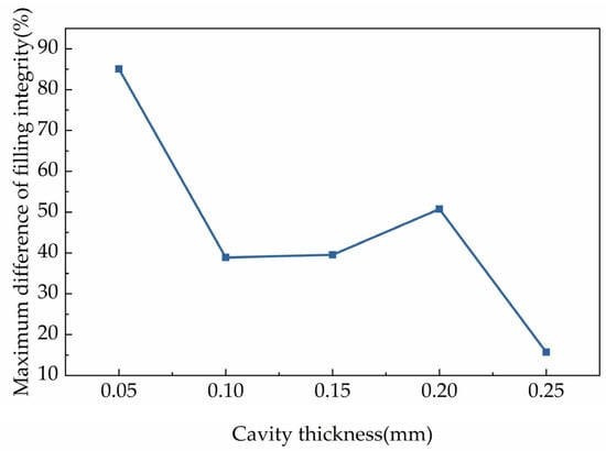For better understanding the effects of the cavity surface roughness on the filling integrity, the maximum gaps of filling integrity with different cavity surface roughness were investigated. The analysis of the maximum gap of filling integrity was performed by calculating the difference of the maximum filling integrity within a certain cavity thickness minus the minimum one and dividing by the minimum one, and the results are shown in Figure 6. The maximum difference of filling integrity in the figure was the mean filling integrity for different cavity surface roughness. It can be deduced that the maximum gap of filling integrity, which was influenced by the roughness of the cavity surface, was different for different cavity thicknesses. When the cavity thickness was 0.05 mm, the maximum difference filling integrity among different parts was 85.07%. However, for the cavity thickness of 0.10 mm and 0.15 mm, the maximum difference was around 40% of the similarity. Moreover, when the cavity thickness was 0.20 mm, the maximum gap rose slightly. After the condition with cavity thickness of 0.20 mm, the maximum gap decreased sharply. The maximum gap was reduced to 15.68% when the cavity thickness was 0.25 mm.