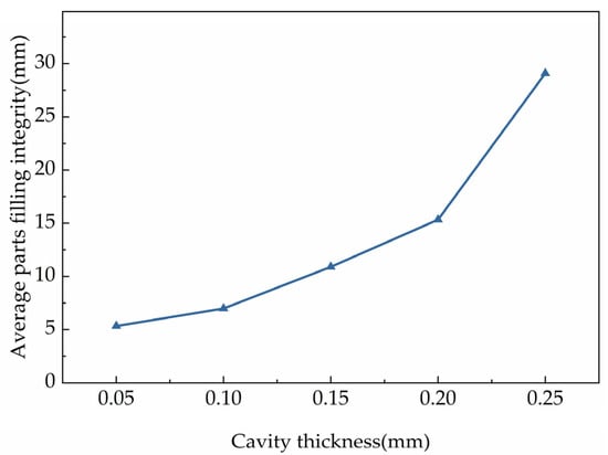 The cavity thickness was an important factor on filling integrity. In order to better understand the effects of the cavity thickness on the filling integrity, the changing trend of filling integrity within different cavity thickness was investigated. Figure 7 showed the changing trend of filling integrity in cavities with different cavity thickness. It can be inferred in the figure that the filling integrity and the rate of improvement were improved as the increasing of the cavity thickness. Moreover, in Figure 8, it showed the parts filling integrity in cavities with different cavity thicknesses. It can be inferred that the average filling integrity was also improved with the increasing of the cavity thickness.