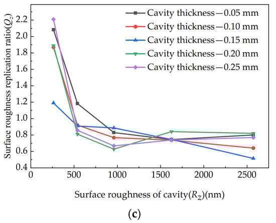 The replication ratio of each roughness parameter under different cavity thickness: (a) Qa, (b) Qq (c) Qz.