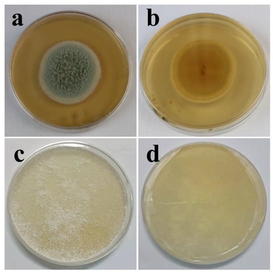 The biological characteristics of fungi are associated closely with their living environments; thus, the liquid environment used to study the fungal effect on coatings shields a large amount of oxygen, causing the limited growth of mycelia (Figure S1, characterization of two fungi in PDB media). The morphologies of T. funiculosus and P. chrysosporium in PDA are shown in Figure 1. After 7 days of incubation, a round colony (45 mm diameter) of T. funiculosus on agar plates with a white edge was found, and the center of conidium was medium dark green from the front view, as shown in Figure 1a. The center of the colony (observed from the back of the plate) had reddish-brown dots with the color intensity decreasing while spreading outwards, as shown in Figure 1b. Moreover, the outermost circle of the colonies was the lightest, which could be the aerial mycelium. Compared with the characteristics of T. funiculosus, the colony features of P. chrysosporium on agar were different. As shown in Figure 1c, the white mycelium of P. chrysosporium was distributed throughout the entire agar instead of a circular colony. The deep layer of P. chrysosporium was also white when observed from the back of the plate without any other color pigmentation (Figure 1d).