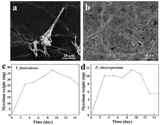 The SEM images of T. funiculosus (a) and P. chrysosporium (b); the growth curves of T. funiculosus (c) and P. chrysosporium (d) in the PDB culture medium.