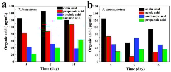 - The total concentration of metabolic organic acid secreted by T. funiculosus and P. chrysosporium was about 412.50 µg/mL and 346.34 µg/mL, respectively. Citric acid, propanoic acid, succinic acid, and tartaric acid had the highest content in the metabolic organic acids secreted by T. funiculosus, while P. chrysosporium secreted oxalic acid, acetic acid, methanolic acid, and propanoic acid.