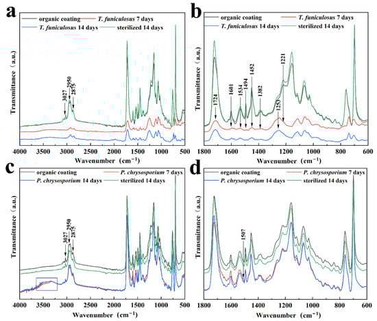 The FTIR spectra of PU coatings with and without treatment by sterilized and microbial PDB medium; with and without treatment by T. funiculosus (a,b), and with and without treatment by P. chrysosporium (c,d).