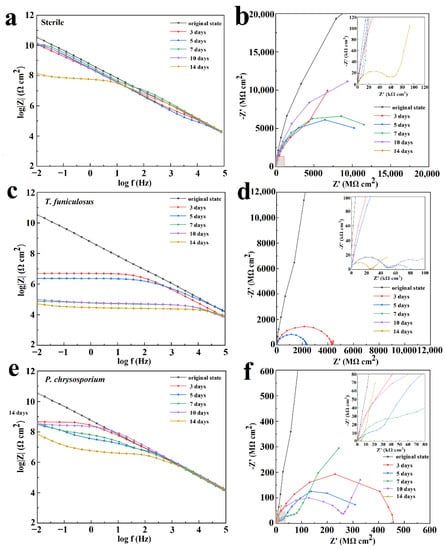 After the colonization of T. funiculosus for 3 days and 5 days in the atmospheric environment, the |Z|0.01Hz values decreased gradually to 5.1 × 106 Ω·cm2 and 2.4 × 106 Ω·cm2, respectively (Figure 6c). The size of the semi-circle also decreased in Figure 6d, indicating that the barrier properties of the coatings became weaker with increasing immersion time. After 7 days of treatment, the |Z|0.01Hz values decreased dramatically to about 7.5 × 104 Ω·cm2 and exhibited a slightly decreasing trend in the last 7 days reaching 5.1 × 104 Ω·cm2 after 14 days of immersion. These results revealed that the coating lost its barrier properties, and corrosion occurred on the metal surface. The enlarged view of the high-frequency region in Figure 6d shows two capacitive reactance arcs and a gradual decrease in the arc radius with increasing immersion time. These results also demonstrated that the coatings lost their corrosion resistance properties after 7 days of colonization by T. funiculosus in the atmospheric environment.