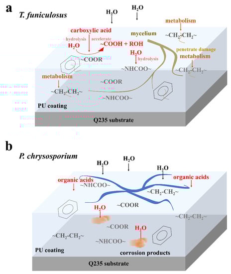 Diagram of the degradation mechanism in PU coatings by T. funiculosus (a) and P. chrysosporium (b) colonization.