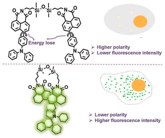 The versatility and widespread use of functionalized disiloxanes and silane coupling agents allows for the design and fabrication of a wide range of siloxane-based fluorescent molecules. A simple design strategy is modifying luminescent dyes onto siloxane. Lin et al. reported Si-O-Si bridged fluorescent molecules based on 1,3-bis(3-aminopropyl)tetramethyldisiloxane and aryl luminescent dyes [34,35,36,37]. As shown in Figure 4, the fluorescent siloxane-based probe (TDCQ) consisted a naphthalimide moiety accepting electron and a triphenylamine fragment providing electrons [36], which was used for monitoring polarity of lipid droplets (LDs) in cells. As the number of LDs differs between normal and cancer cells, the probe emitted stronger green fluorescence in cancer cells, providing an effective method for distinguishing between normal and cancer cells. Notably, it was reported that TDCQ possessed outstanding photostability and biocompatibility due to the uniqueness of the siloxane component.