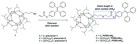 Polyhedral oligomeric silsesquioxanes (POSS) as a kind of siloxanes with unique cage structure have attracted intense attention in the last decade. POSS possess ideal 3D inorganic–organic hybrid structures, which consist of a rigid inorganic siloxane core and surrounding reactive organic functional groups (R groups). The R groups are diversified and adjustable [41]. It was worth noting that POSS units could suppress the self-quenching of organic luminescent dyes and further improve their quantum efficiency by virtue of their 3D scaffold structures [42]. Benefiting from this special feature, POSS have been considered an ideal platform for constructing fluorescent molecules [43,44,45]. As illustrated in Figure 6, Zhou et al. constructed three kinds of POSS-based fluorescent materials (POSS-AN8, POSS-AN15, POSS-AN21) by modifying different tetraphenylenes (TPE) onto a single-angle of POSS via thiol-ene click reaction [46]. These mono-TPE modified POSS molecules with AIE effect exhibited stronger fluorescence emission intensity than the TPE monomer, and could act as a sensitive fluorescence probe to monitor the self-assembly of POSS molecules in solvents.