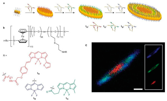 Hudson et al. constructed controllable nanostructured polysiloxane in two dimensions by modifying three kinds of fluoroboron dipyrrole (BODIPY)-based dyes emitting red, green, and blue light, respectively, onto side chains of polysiloxane [50]. As shown in Figure 7, platelet hierarchical micelles with colors of red, green, and blue could be observed under laser scanning confocal microscopy (LSCM). The precise control of micelle was derived from crystallization-driven self-assembly of copolymer, and the multishaped hierarchical micelles, such as cylinder, single- and double-headed spear, were fabricated by this universal method. In the same year, this group prepared color-tunable fluorescent multiblock micelles by controlling the ratio of red–green–blue ternary colors on poly(ferrocenyldimethylsilane) [51], and successfully constructed white light-emitting nanomaterials with a CIE coordinate of (0.33, 0.33). In addition, clear fluorescent imaging multiblock micelles were obtained by the addition of nonfluorescent spacer into fluorescent polysiloxane, thereby revealing that this kind of polysiloxane has potential applications in bio-diagnostics, microdisplay technology, and encoded nanomaterials.