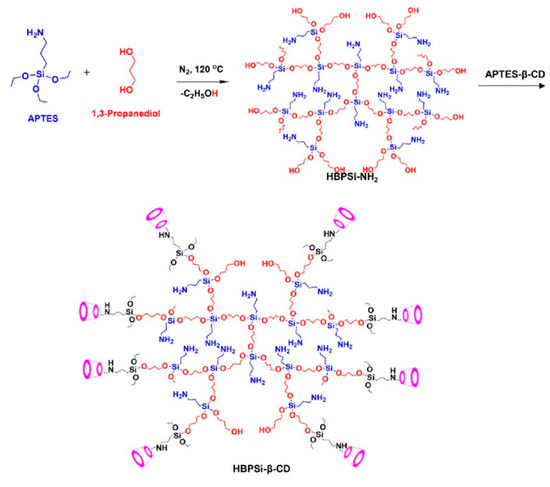 Synthesis route of HBPSi-β-CD [59]. Copyright 2022, American Chemical Society.