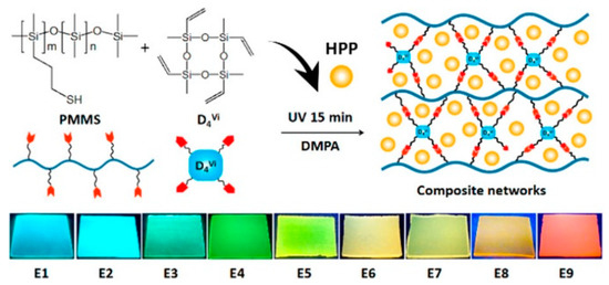 Our group [68] prepared the multicolored polysiloxane elastomers by physically blending fluorescent hybrid porous polymers (HPPs) into a polysiloxane matrix, following an efficient thiol−ene cross-linking reaction of poly[(mercaptopropyl)methylsiloxane] (PMMS) and tetramethyltetravinylcyclotetrasiloxane (D4vi). Thereinto, the HPPs were fabricated by the Heck reaction of octavinylsilsesquioxane and 4,4′-dibrombiphenyl and/or 1,3,6,8-tetrabromopyrene, and their colors could be easily regulated from blue to red by controlling the molar ratio of biphenyl and pyrene units (Figure 10). The HPPs were insoluble in common solvents; however, they could be well dispersed in the polysiloxane matrix when the amount of HPPs was below 20 mg per gram of PMMS. This work provided an effective approach to dope insoluble fluorophores into the polymer matrix and further develop fluorescent devices.