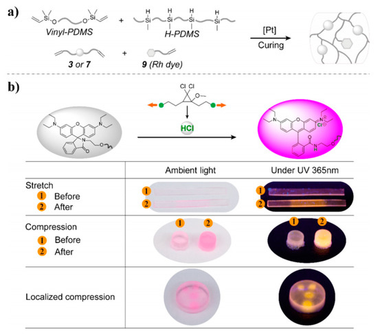 Although the physical method for preparing cross-linking polysiloxanes is simple and convenient, the doping amount is limited due to the poor compatibility between fluorescent materials and polysiloxane substrates. In addition, the fluorescent materials may aggregate or precipitate within the crosslinked network after prolonged use, which affects the luminescence homogeneity and optical stability of the materials. To overcome this defect, researchers have introduced fluorescent units into cross-linked polysiloxane systems by chemical bonding. Lin et al. prepared stress-responsive polysiloxanes by reacting mechanoacid diene and rhodamine dye derivatives with poly(dimethylsiloxane) (PDMS) (Figure 11a) [69]. As shown in Figure 11b, when the material was stressed, the mechanical acid released protons to protonate the rhodamine dye, which caused the material to turn red under daylight and emit bright yellow light under 365 nm UV irradiation.