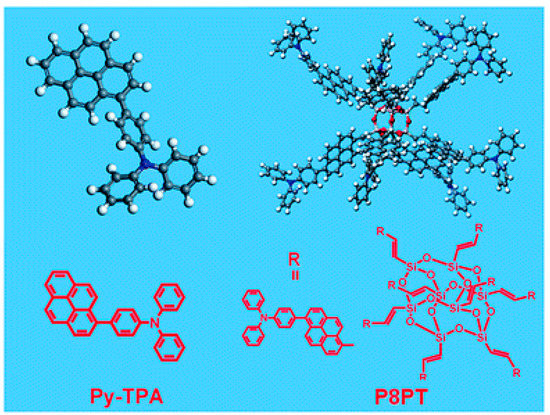 In recent years, POSS and their derivatives have drawn increasing attention in the fields of OLEDs because POSS units can enhance the thermal and mechanical properties as well as fluorescence quantum yields of OLEDs by taking advantages of the POSS units, including high thermal stability, rigid cubic geometry, and the three-dimensional structure [98,99,100]. Cheng et al. prepared 3,6-dipyrenylcarbazole-POSS hybrids (POSS-DPCz) by hydrosilylation reaction (Figure 17) [101]. The 3D POSS effectively suppressed the aggregation of conjugated fluorescent dyes (DPCz) and improved the fluorescence quantum yields of optical devices. The OLEDs made from POSS-DPCz emitted a stable blue light (450 nm) with a maximum brightness of 8900 cd/m2, which was almost two-fold higher than the DPCz-based OLEDs.
