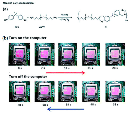 A thermally responsive polysiloxane (Dns-non) with unique two-photon luminescence was first reported by Zuo et al. [84]. The sensor was fabricated by incorporating rhodamine-B into benzoxazine-containing polysiloxanes (P1) (Figure 13). The fluorescence of Dns-non could switch from the “on” to “off” state reversibly along with the heating and cooling process. Furthermore, Dns-non was developed to a CPU temperature sensor by easily coating it onto the CPU surface and was utilized for monitoring the temperature of the CPU in situ by observing the color change.
