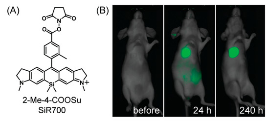 (A) The structure of 2-Me-4-COOSu SiR700. (B) In vivo tumor imaging with SiR700-labeled anti-tenascin-C antibody [94]. Copyright 2012, American Chemical Society.