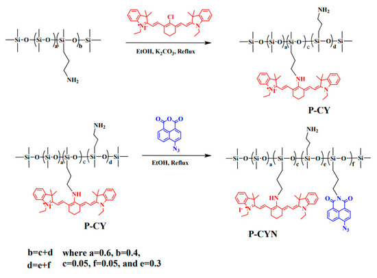 The preparation process of a fluorescent polysiloxane (P-CYN) with a dual fluorescent mode [96]. Copyright 2020, Royal Society of Chemistry.
