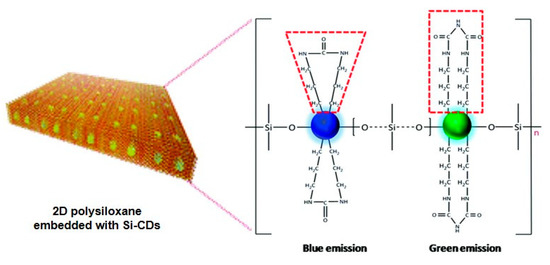 The sol-gel method has been also widely utilized to fabricate cross-linking polysiloxanes due to its simple operation and low-temperature processing. Liu’s group selected silane pre-functionalized carbon dots (SiCDs) and silane coupling agents to synthesize a series of fluorescent gels (SiCD-Gel) by this method [70]. Notably, the loading amount of SiCDs in polysiloxane was adjustable from 0% to 100%. The properties of SiCD-Gel were comparable to or better than SiCDs in solutions.