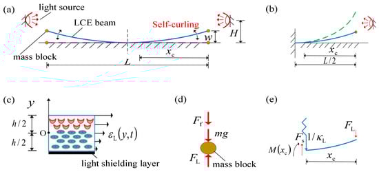 Figure 1 plots the schematic diagram of a photo-responsive LCE beam-mass system that can sustain a self-curling motion under steady light. Initially, the LCE beam is placed on a horizontal table with mass blocks of mass m being attached to each end, as shown in Figure 1a. The LCE beam has length L and thickness h. The mass of the LCE beam is assumed to be much smaller than that of the mass block, and thus the inertia of the LCE beam is neglected. When a light source at fixed height H is introduced at each end of the LCE beam, only the upper surface of the LCE beam is exposed to light, and the LCE beam will bend upward as a result of the light-driven non-uniform contraction along the thickness direction, thereby in turn promoting the mass block to move upward. After the mass block passes the light source, the upper surface of the LCE beam is no longer illuminated, instead the lower surface is illuminated. Here, we assume that the lower surface is coated with a light-shielding layer. Subsequently, the LCE beam will bend back due to the recovery of light-driven contraction on the upper surface, leading to promote the mass block to move downward quickly. When the mass block moves rapidly downward below the light source, the upper surface of the LCE beam is exposed to light again, causing the mass block to be driven upward again subsequently. Ultimately, the LCE beam-mass system can undergo self-sustained curling motion under steady light. It is worth noting that the size of the contact surface between the LCE beam and the horizontal table is constantly varing during the curling process of the LCE beam, resulting in a dynamic boundary problem.