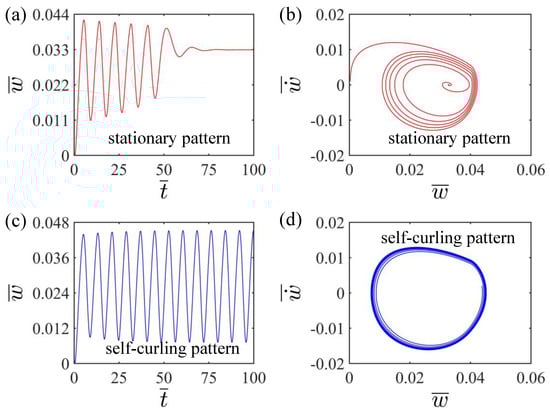 (a) Time history and (b) phase trajectory diagram of the stationary pattern of the LCE beam-mass system for , , , , , and . (c) Time history and (d) phase trajectory diagram of the self-curling pattern of the LCE beam-mass system for , , , , , and . Two motion patterns exist for the LCE beam-mass system under steady light: the stationary pattern and the self-curling pattern.
