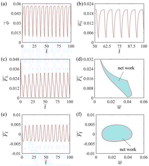 To investigate the self-oscillating curling mechanism of the LCE beam, Figure 3 displays the evolutions of several key parameters for the self-curling pattern of the LCE beam in Figure 2c,d. Figure 3a plots the time dependence of the cis number fraction of the LCE material, showing a periodic variation with time. Figure 3b plots the time dependence of the curvature of the LCE beam, which also varies with time periodically. Figure 3c plots the time dependence of the elastic force acting on the mass block from the LCE beam, and it is evident that the elastic force also varies with time in a periodic manner. As shown in Figure 3d, the dependence of the elastic force on the displacement of the mass block is plotted. There forms a closed curve in one cycle. The area enclosed by this closed curve represents the net work done by the elastic force, calculated as . Meanwhile, the time dependence of the damping force acting on the mass block is plotted in Figure 3e, and the results show that the damping force varies periodically with time. The dependence of the damping force on the displacement of the mass is plotted as shown in Figure 3f. There also forms a closed curve in one cycle. The area enclosed by this closed curve represents the damping dissipation energy, which is calculated as . It is equal to the net work done by the elastic force so that a continuous and stable self-oscillating curling state can be maintained.