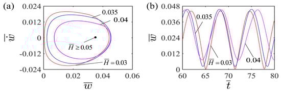 Effect of dimensionless light source height on the self-curling of the LCE beam-mass system for the other parameters , , , , and . (a) Limit cycles; (b) Time histories for different light source heights . Both amplitude and period of the self-curling increase as the light source height increases.