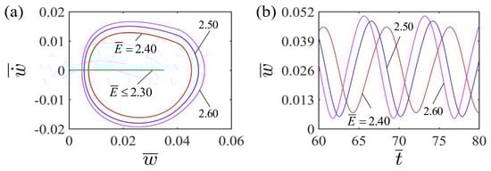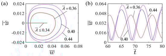Figure 7 shows the effect of the dimensionless elastic modulus on the self-curling of the LCE beam. In the calculation, we set the other parameters to , , , , and . Figure 7a depicts the limit cycles of the self-curling of the LCE beam for different elastic moduli . There exists a critical elastic modulus for the self-curling of the LCE beam, being about 2.3. When the dimensionless elastic modulus is below the critical value, the LCE beam finally stays in the static equilibrium position and maintains a stable stationary pattern. This is because the smaller the elastic modulus , the softer the LCE beam is, thus the mechanical energy of the system arising from the conversion of light energy is unable to compensate for the energy lost in damping to maintain the self-curling. For , and , the self-curling pattern of the LCE beam will occur, with their limit cycles being plotted in Figure 7a. Meanwhile, Figure 7b shows the effect of dimensionless elastic modulus on the amplitude and period of the self-curling. As the dimensionless elastic modulus increases, the amplitude increases significantly while the period decreases. This is due to the fact that a larger dimensionless elastic modulus will provide a larger elastic force and a smaller eigenperiod, which is consistent with physical intuition.