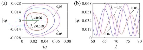 Effect of dimensionless light intensity on the self-curling of the LCE beam-mass system for the other parameters , , , , and . (a) Limit cycles; (b) Time histories for different light intensities . As the light intensity increases, the self-curling amplitude displays a significant increase, while the self-curling period remains almost unchanged. Figure 6 presents the effect of different light intensities on the self-curling of the LCE beam. In the calculation, we set the other parameters , , , , and .