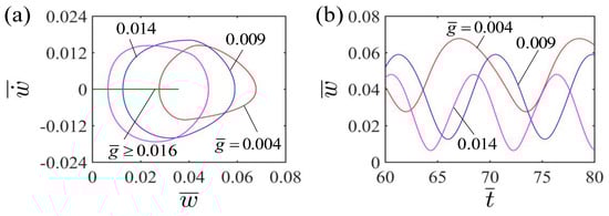 Effect of dimensionless gravitational acceleration on the self-curling of the LCE beam-mass system for the other parameters , , , , and . (a) Limit cycles; (b) Time histories for different gravitational accelerations . As the gravitational acceleration increases, the self-curling amplitude exhibits a considerable decrease, and the self-curling period is suppressed. Figure 8 presents the effect of dimensionless gravitational acceleration on the self-curling of the LCE beam. In the calculation, we set the other parameters , , , , and .