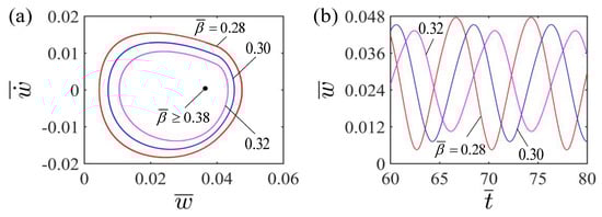 Effect of dimensionless curvature coefficient on the self-curling of the LCE beam-mass system for the other parameters , , , , and . (a) Limit cycles; (b) Time histories for different curvature coefficients . As the dimensionless curvature coefficient increases, the self-curling amplitude increases significantly, while the self-curling period remains almost constant.