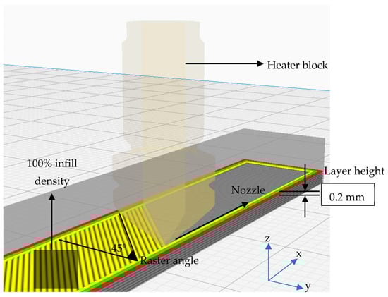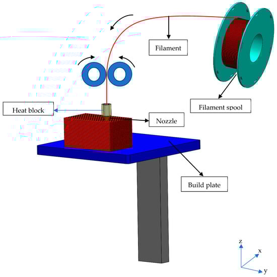 Additive manufacturing (AM) technologies have become one of the competitive manufacturing techniques for the precise production of parts with high geometric complexity [,]. The most preferred AM method is fused deposition modelling (FDM), also referred to as fused filament fabrication (FFF) []. In FDM technology, the type of polymer used is liquefied and extruded in a semi-molten form using a nozzle with a particular effort and deposited on the path obtained by slicing the computer-aided design (CAD) geometry [,,]. The part that reaches the final design with CAD software is converted into a stereolithography (STL) file and loaded into the software to divide the part into layers with cross-sections based on the specified layer thickness [,]. In this software, the G-code is obtained by determining the geometric parameters such as layer thickness, wall thickness, infill density and infill pattern, production parameters such as nozzle and build plate temperature, and print speed [,]. In this technique, the used filament is pushed towards the heated liquefier with the help of stepper motors and extruded using a nozzle as a semi-melt material. In order to deposit the semi-molten material on the determined path, the build plate or nozzle moves in the transverse and transitional directions. In this context, all paths on a layer are followed by completing the layer and passing it to the next layer []. A schematic representation of a typical FDM 3D printing technique is given in Figure 1.