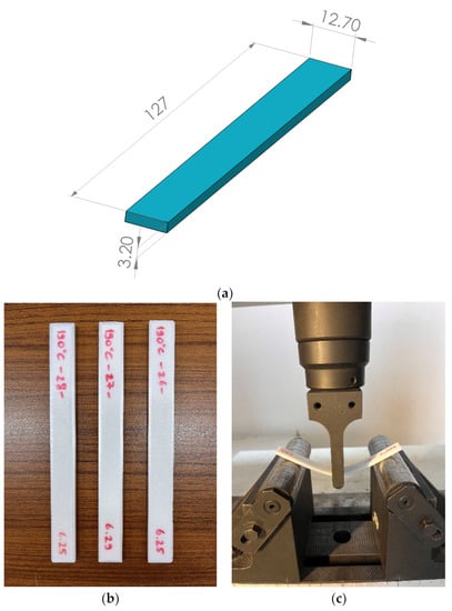 Flexural characterisation of PLA parts exposed to 405 nm UV irradiation at different durations was performed by three-point bending tests. In order to minimise experimental errors, five tests were performed for each parameter, and the average values were recorded as test results. Three-point bending tests were performed according to ASTM D790 standard [] to determine the behaviour of PLA parts against bending load. Three-point bending tests were carried out at 1 mm/min at room temperature using a Shimadzu 100 kN device. As a result of these tests, bending properties such as flexural strength and flexural modulus were determined. Dimensions of a three-point bending test specimen, produced specimens, and during testing with Shimadzu 100 kN instrument are given in Figure 3.