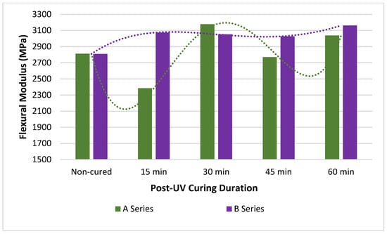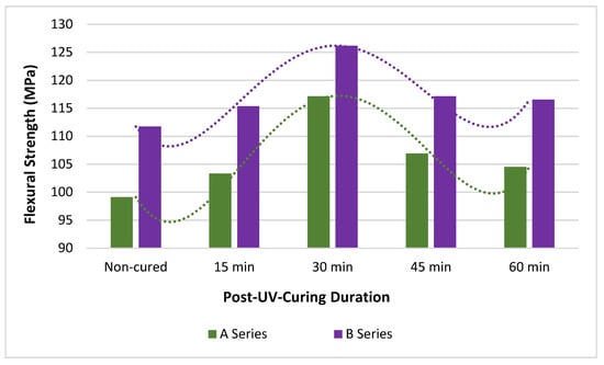 - When the UV-irradiation application is examined for the flexural strength values of the samples, cured samples show higher values than non-cured samples, regardless of the temperature at which they are produced. The application of the post-UV curing process causes the flexural strength values of the samples to behave characteristically the same regardless of the A and B series. Up to 30 min of post-UV curing application causes the flexural strength values to increase gradually, reaching the highest value after 30 min and hovering around a certain value after 30 min of application. Among both A and B series specimens, 30 min post-UV-cured ones have the highest flexural strength and non-cured ones have the lowest flexural strength. When A series specimens are compared with each other in terms of flexural strength, A2 is 4.25% higher than A1, A3 is 13.37% higher than A2; however, A4 is 8.72% lower than A3, and A5 is 2.24% lower than A4. When this comparison is made for the B series specimens, B2 is 3.22% higher than B1, B3 9.38% higher than B2, although B4 is 7.14% lower than B3, and A5 0.51% lower than A4.