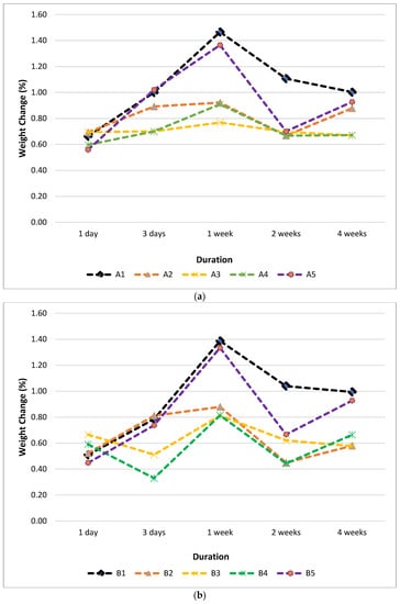 Weight change—duration water absorption behaviour graphs of PLA samples are given in Figure 7. After 1 week of exposure, all samples show the highest absorptive ability. It is observed that the absorption amount is at the highest level among all A and B series samples, which were kept in distilled water for a week. It is determined that the 60 min post-UV-cured samples generally have the highest absorption capacity for all periods. The absorptive ability of non-cured samples is at the lowest level for all samples and all durations. Thanks to the porous structure arising from the nature of production with the FDM technique, water uptake can be achieved towards the inner layers of the samples. Although the samples with the post-UV curing process show different water uptake values compared to the non-cured samples, the trend shows the same direction and approximately similar behaviour. Its water intake capability causes reduced pores when production is made with high production temperature, and therefore less water intake can occur [,]. The sample water intake capabilities have the highest value among themselves due to the irregularities and deteriorations on the A5 and B5 sample surfaces (Figure 8e,f).